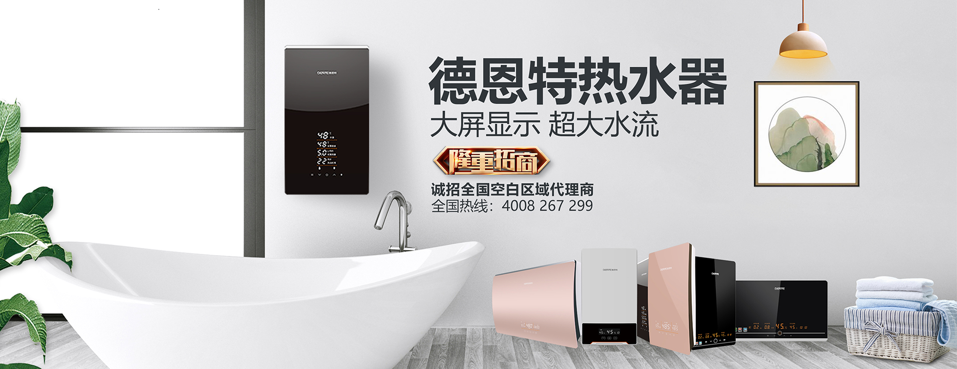2005年,德恩特品牌全系列高品質產品推向中國市場,品牌旗下快熱式電熱水器、速熱式電熱水器、快熱儲水組合式電熱水器、燃氣熱水器和凈水機等“水家電”系列產品。